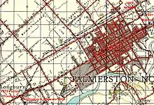 The original station was opened on 20 October 1876, when the Foxton Tramway was reopened as the Foxton Branch, though from 25 July 1873 the Square had been the terminus for the tramway.[4] In 1883 the Wellington–Manawatu Line south to Wellington opened, increasing traffic. The line was constructed from Wellington to Longburn by the private Wellington and Manawatu Railway Company (W&MR), and initially trains terminated at Longburn, forcing passengers to change trains to NZR services to Palmerston North. Eventually, NZR and W&MR finalised an interchange agreement, allowing W&MR passenger and mail trains to terminate at Palmerston North Central station.[5] A special dock platform at the south of the station was constructed for W&MR trains to Wellington.[5]