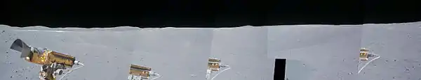 On April 21, 1972, the Apollo 16 Lunar Module (LM) Orion landed about 1.5 km south of Palmetto, which is between the prominent North Ray and South Ray craters. The astronauts John Young and Charles Duke explored the area over the course of three EVAs using a Lunar Roving Vehicle, or rover. They drove along the rim of Palmetto on EVA 3, on their way to North Ray, but did not stop. As they drove by, Duke said "There's a good ejecta blanket of half-meter-size boulders around the rim of Palmetto into some of these secondary craters here."[2] On the way back to the lunar module from North Ray, Duke took a sequence of photos of Palmetto while riding on the rover.