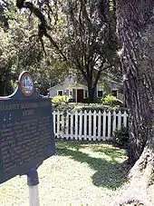 In the late winter of 1867, Stowe followed her son to Florida, finding that the warmer weather allowed her to spend more time on two novels she was writing. Her first weeks in Orange Park utterly transformed her and she became enchanted with Florida at once,[13] writing that she felt she had sprouted wings and become "young & frisky".[14] She accompanied her son one day to collect the mail, which was deposited in Mandarin, about 3 miles (4.8 km) across the St. Johns River. They rowed to the eastern shore and Stowe fell in love with a cottage in Mandarin, attached to an orange grove. Stowe's transformation in Florida was rooted in her identification and familiarity with Puritan New England: industry and thrift in a climate where cold sharpened one's senses and values. The laid-back attitude of the people and warmth of the Southern climate were seductive. She at first attempted to persuade her brother Charles to purchase the land in Mandarin, writing to him and asking "How do you think New England theology would have fared had been landed here instead of Plymouth Rock?"[1] She wrote about the land and climate intoxicating her and pondered the effect it might have had on literature when she posed an idea to her publisher: "I hate to leave my calm isle of Patmos—where the world is not and I have such quiet long hours for writing. [Ralph Waldo] Emerson could insulate himself here and keep his electricity. [Nathaniel] Hawthorne ought to have lived in an orange grove in Florida."[15]