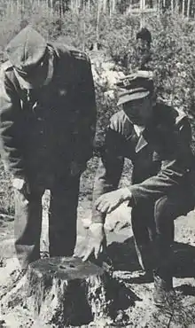 At the glade the prisoners' bags were taken but they were permitted to keep their documents and small belongings. Jews could keep their yellow badges, and people who worked in Pawiak's infirmary could keep their badges with the Red Cross symbol. Sometimes prisoners' hands were tied and their eyes blindfolded. The victims were then taken to the edge of the grave and executed by machine gun fire. Sometimes victims were forced to hold a long pole or ladder behind their back. Such supports were later lowered so that the bodies fell into the grave in an even layer. Postwar exhumation proved that the wounded victims were sometimes buried alive.[12][15] SS and OrPo members photographed the executions until it was forbidden by the SS-Standartenführer Meisinger, as happened on 3 May 1940.[16] After the execution was finished, the graves were filled in, covered with moss and needles, and then planted over with young pine trees. Families of the victims were later informed by the Nazi authorities that their relatives had "died from natural causes".[11][17]