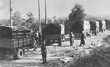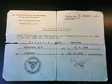 Victims were transported to the place of execution by trucks. Usually they were brought from Pawiak prison, rarely from Mokotów Prison. SS soldiers tried to convince their victims that they are going to transfer them to another prison or to a concentration camp. For this reason, death transports were usually formed at dusk and prisoners were allowed to take their belongings with them. Sometimes before departure convicts received an additional food ration and they were given back their documents from the prison's depository.[12] Initially, these methods were so effective that the prisoners were not aware of the fate awaiting them.[13] Later, when the truth about what was happening in Palmiry spread through Warsaw, some victims tried to throw short letters or small belongings from the trucks, in hopes that in this way they would be able to inform their families about their fate.[12] During postwar exhumation some bodies were found with a card reading "Executed in Palmiry", written by the victims shortly before their death.[14]