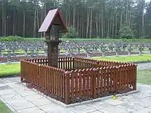 In 1948 the forest glade near Palmiry was transformed into a war cemetery and a mausoleum.[51] Victims of Nazi terror whose bodies were found in some other places of execution within the so-called "Warsaw Death Ring"[lower-alpha 5] were also buried in the Palmiry cemetery. Altogether, approximately 2204 people are buried there.[52] In 1973, the Palmiry National Memorial Museum, a branch of the Museum of Warsaw, was created in Palmiry.[51]