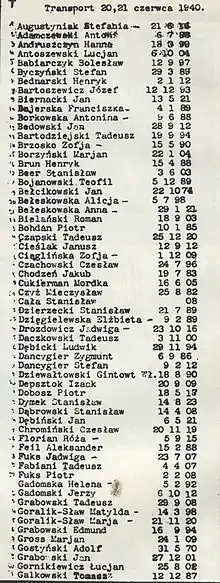 The best-documented massacre took place on 20–21 June 1940 when three transports with 358 inmates were sent from Pawiak to the place of execution near Palmiry. Among the victims were:[36][37]