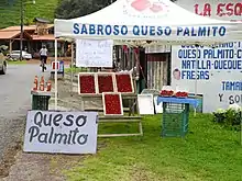 Palmito cheese is mainly produced in the canton of Zarcero in the province of Alajuela.[1] It is manufactured in the regions of San Carlos, Santa María de Pocosol, Nuevo Arenal, Venado, Guatuso, Patasto, Aguas Zarcas and Coopevega. It can be purchased at supermarkets, shops, roadside stands, and farmers markets.[1][2]
