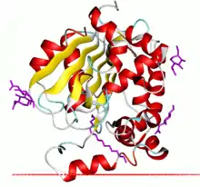Palmitoyl protein thioesterase 1. Red plane shows hydrocarbon boundary of the lipid bilayer