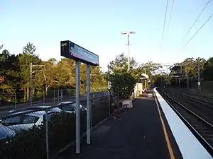 Palmwoods station opened in 1891.[1] The station today consists of one platform with a wooden structure. In 2009, the platform was extended at both its northern and southern ends with scaffolding and plywood materials.[2] Initially intended as an interim arrangement until a permanent extension was built, the temporary platform remains.[3]