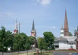 Palmyra claims to be the only city or village in the U.S. to have four churches at a four corner intersection facing each other.[5] It is one of ten places in the world that has four churches on the four corners of two intersecting highways. The "four corners" churches are at the intersection of New York State Route 21 and New York State Route 31.