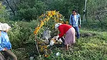 In 1522, the Pame "allied with neighboring allies to resist the Spanish, but they were defeated and forced to accept mission life, like most other indigenous peoples of Latin America." Under missionization, the Pame were "settled in and around the missions" which simultaneously led to Christianization and an end to their largely nomadic way of life as "the Pame were converted to Christianity and taught the skills of sedentary farming."[2] The Pame lost territory in the Bajío in the 1530s to Otomi settlements and Spanish rancherias moving into the area. They reportedly played a minor role in the Chichimeca War with the Spanish, "limited to small raids on cattle ranches" in the Bajío, which caused minor casualties on either side. Cattle ranches had invaded much of the "more hospitable areas of [their] Rioverde [territory] after 1600."[3]