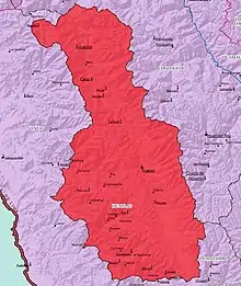 The history of Pampas Grande before the arrival of the Spanish is very little known. The Kajur archaeological site,[6] located at 1250 meters above sea level,[7] evidences one of the oldest human settlements in this part of the Cordillera Negra. The Cuchicoto archaeological site located near the Canchón summit shows the influence of the Recuay culture during the Early Intermediate period.[8] Inca domination occurred between approximately 1430 and 1450, during the rule of the Sapa Inca Pachacútec. The lordships of huaylas and conchucos were incorporated into Tahuantinsuyo after a fierce invasion by the Inca Cápac Yupanqui, brother and general of the Sapa Inca, who was forced to withdraw and build the Maraycalle tambo in Yauya.[9] The first reference to Pampas Grande during the colony it is made in the year 1618.[10] In 1774 the parish of La Asunción de Huaylas was founded, with two partialities: Allauca and Ichoc.[11] Here the town of Pampas was assigned, forming its population members of the ayllu Poma, west of the town of Cajamarquilla.[12] By 1830 the parish of Pampas,[n 2] was made up of the town of the same name and another called Huanchay. By 1857 the district of Pampas was created with its capital Pampas.[14] In 1907 the district of La Libertad was detached from Pampas. [15] In 1933, the district of Huanchay was created in the southern part of the district of Pampas.[16] In 1941, the Colcabamba district was detached from Pampas.[17] In 2009, a popular consultation was held to change the name of the town from Pampas to Pampas Grande.[18] On March 15, 2012, the town was formally renamed Pampas Grande through the Law No. 29846.[1]