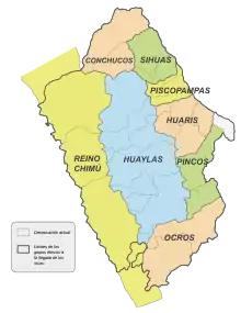In 1605 in the part that is today Pampas Grande the huaranga of Ichocpoma belonging to the saya of Lurin-Huaylla was located.[33] In 1651, in the Huaylas huaranga the doctrine of La Asunción de Huaylas was founded, with two partialities: Allauca and Ichoc.[34] Here was the town of Pampas, with the ayllu Poma, west of Cajamarquilla.[12]
