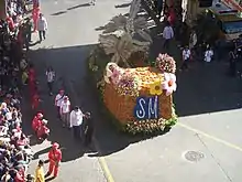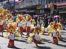 Panagbenga Festival (transl. Flower Festival) is a month-long annual flower occasion in Baguio. The term is of Kankanaey origin, meaning "season of blooming".[1] The festival, held in February, was created as a tribute to the city's flowers and as a way to rise up from the devastation of the 1990 Luzon earthquake.[2] The festival includes floats that are covered mostly with flowers not unlike those used in Pasadena's Rose Parade. The festival also includes street dancing, presented by dancers clad in flower-inspired costumes, that is inspired by the Bendian, an Ibaloi dance of celebration that came from the Cordilleras.