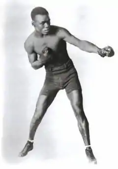 Panama Joe Gans was a black boxer who held the World Colored Middleweight Championship for four years, shortly before it was discontinued.[1] Born Cyril Quinton Jr. on November 14, 1896 in Barbados, British West Indies and raised in the Panama Canal Zone, the 5'7" Quinton originally fought out of Panama and then New York City. He took his ringname from boxing great Joe Gans, the first black American fighter to win a world boxing title. He found his greatest fame fighting as a middleweight at between 147 and 160 lbs, but in his early career he took the Panamanian Lightweight Title and contended for the Panamanian Welterweight Title at weights roughly between 130 and 147 pounds.[2]