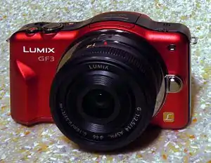 ![]() Panasonic Lumix DMC-GF3 with body color red and the Lumix G 14mm F2.5 lens attached | |