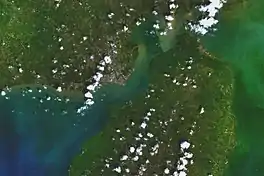 ![]() Satellite view of Iloilo City and Guimaras Island, with the gulf at the lower left | |