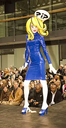Pandemonia is a character and persona created as conceptual art by an anonymous London-based artist that has appeared in the art and fashion world since 2009.[1] Clad in a latex full-head mask with stylized hair and latex dresses,[1] Pandemonia is seven feet tall and was described by Katia Ganfield of Vice as "Roy Lichtenstein's blonde caricatures ... brought to life as a 7 ft Jeff Koons inflatable".[2] She is often accompanied by an inflatable white dog named Snowy.[1][2]