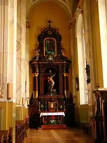 The ceiling of the apse is decorated by a 22-by-14-metre (72 ft × 46 ft) fresco by Jonas Mackevičius depicting Saint Casimir appearing to Lithuanian soldiers during the 1518 Siege of Polotsk. The fresco was restored in 2002.[3] The walls of the apse depict ten churches of ten deaneries of the diocese. The side aisles end with oak altars produced by Joseph Rifesser. The left altar features a copy of the Sistine Madonna and a painting of Saint Casimir surrounded by sculptures of Albert of Riga and Saint Monica. The right altar features a sculpture of Saint Francis of Assisi helping crucified Jesus, modeled after a painting by Bartolomé Esteban Murillo, and a painting of Saint Stanislaus. Puzinas painted the ceiling vaults with frescoes of angels in the clouds while ceiling of the chapels was decorated with images of the Four Evangelists. He also created eight large paintings that hang in the naves.[2]