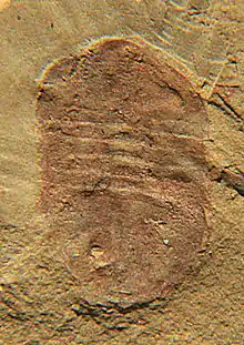 Panlongia was a small-sized (up to 2 cm) marine arthropod, with an oval-shaped non-calcified exoskeleton. Both the head shield (or cephalon) and the tail shield (or pygidium) are semi-circular. In between the cephalon and pygidium are four thoracic body segments (somites). The cephalon occupies approximately ⅓ of the body length, the thorax ¼ and pygidium about 45%. Panlongia lived during the late Lower Cambrian (Botomian) in what is today South China. In Panlongia spinosa the edge of the exoskeleton carries several small sawtooth-like spines, that are absent in P. tetranodusa.[1]