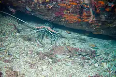 In P. versicolor the reproduction usually takes place in summer, but it can happen all year around. Mating occurs belly to belly after a love parade. The spermatophore released by the males adheres to the female's sternum for several weeks. Females carry their eggs, about several hundred thousand, under their abdomen. A long oceanic larval phase follows, with several moults.[3] These spiny lobster are nocturnal and solitary.[5] In the daytime they hide in small caves and crevices in reefs or under coral.[5] They are carnivores, eating both carrion and fresh caught arthropods, other crustaceans, and occasional small fish.