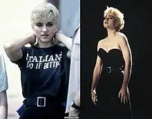 The music video for "Papa Don't Preach" was directed by James Foley, who had previously worked with Madonna on "Live to Tell";[63] production was done by David Naylor and Sharon Oreck, while Michael Ballhaus was in charge of the photography.[64] It was shot on location over three days in Staten Island, New York and Manhattan; according to Foley, Madonna wanted something "a bit more grounded and 'drama'", having just done the "very glamorous and stylized" videos for "Material Girl" and "Like a Virgin", thus he suggested filming in Staten Island.[65] Actor Danny Aiello was chosen by the singer to play her father on the clip; Aiello claimed he had never heard of the singer before and only agreed to do the video by petition of his daughter.[65][66] Actor Alex McArthur was signed on to play the singer's boyfriend and father of her child; she had spotted McArthur in a small role in the 1985 film Desert Hearts and thought he was a natural to play her mechanic boyfriend; "I was out in the garage working on my Harley [...] I answered the phone and a voice said, 'Hi, this is Madonna. I would like you to be in my next video'", the actor recalled.[67] For the music video, Madonna sported a complete image makeover: she changed the heavy jewelry and make-up, and adopted a gamine look similar to the one donned by Shirley MacLaine and Audrey Hepburn during the 1950s.[68][69] The video interspersed shots of the singer as a tomboy - dressed in jeans, black leather jacket, and a slogan T-shirt with the caption "Italians do it better" - with those of her in a "figure-revealing" outfit, consisting of a 1960s-style black bustier top and capri pants. Her body was also leaner and muscular.[70] Of the alternating looks and shots of the singer, Foley recalled: