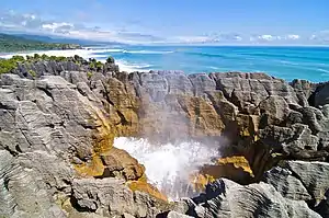 The Paparoa coastline is characterised by high cliffs cut away by waves from the Tasman Sea, with indented coves and sandy beaches. There are small islands off shore and rock pillars. These terraces were once islands, which became part of the mainland when New Zealand was uplifted quite recently in its geological history. The most well known feature of the coastal region is the "pancake rocks" at Dolomite Point, near Punakaiki, where evenly layered stacks of platey limestone have been eroded in places to form surge pools and blowholes.[4]
