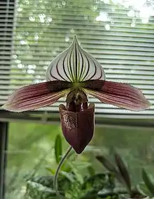 Paphiopedilum purpuratum exhibiting good symmetry.