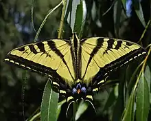 Like the other tiger swallowtails, the western tiger swallowtail was formerly classified in genus Pterourus, but modern classifications all agree in placing them within Papilio.