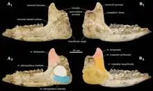 Pappaceras is known from a vast amount of cranial material, although only some scant postcranial remains. The largest species is P. confluens, followed P. minuta.[3] The average size of all species, is about equal with a large dog, even though later genera like Juxia reached the size of a modern horse and Paraceratherium exceeded the size of the largest African elephant.[7] Each species is distinguished by cheek tooth morphology, with the remaining skull quite similar.[3] Like primitive rhinocerotoids, Pappaceras possesses blunt ends on the tips of its nasals, above the nasal incision. Unlike all modern rhinoceroses, the nasals of Pappaceras, as well as many related genera, lack rugosities, which suggests that they lacked any form of horn. The nasal incision extends fairly far into the upper jaw, ending just posterior to the canine. Pappaceras possesses a small post-incisor diastema, not as large as its descendants, and similar in size to that of Hyracodon.[8]