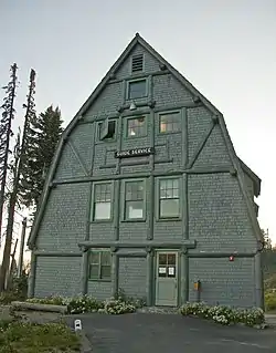 The Guide Service Building is a 3+1⁄2-story timber-frame structure opposite the Paradise Inn. It was built by the Rainier National Park Company in 1920 features a distinctive gambrel roof to house mountain climbing guides. The basement contains a small auditorium and stage, while the ground floor houses offices. The upper levels are dormitory spaces.[2][6]