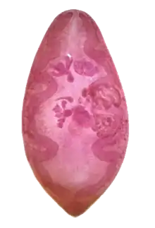 In size, shape, and color, Paragonimus westermani resembles a coffee bean when alive. Adult worms are 7.5 mm to 12 mm long and 4 mm to 6 mm wide. The thickness ranges from 3.5 mm to 5 mm. The skin of the worm (tegument) is thickly covered with scalelike spines. The oral and ventral suckers are similar in size, with the latter placed slightly pre-equatorially. The excretory bladder extends from the posterior end to the pharynx. The lobed testes are adjacent from each other located at the posterior end, and the lobed ovaries are off-centered near the center of the worm (slightly postacetabular). The uterus is located in a tight coil to the right of the acetabulum, which is connected to the vas deferens. The vitelline glands, which produce the yolk for the eggs, are widespread in the lateral field from the pharynx to the posterior end. Inspection of the tegumental spines and shape of the metacercariae may distinguish between the 30-odd species of Paragonimus spp. but the distinction is sufficiently difficult to justify suspicion that many of the described species are synonyms.[5]