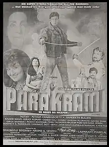 Parakrami is an action thriller, featuring Nutan, Mithun Chakraborty, Sangeeta Bijlani, Kader Khan, Kiran Kumar and Charan Raj. The film was supposed to get released in 1991, but to date remains unreleased. Promos from the film were seen on television at the time it was supposed to release.[1][2][3] Actress Nutan died in February 1991 and this was the last film she worked on before her death.