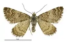The expansion of the wings is 3⁄4in. The fore wings are dull grey-ish brown, greenish-tinged. There is a wavy darker band near the base ; a broad median band with a strong rounded projection towards the terman above middle ; a dull greenish band on termen preceded by row of pale dots on veins, cilia grey with blackish bars. The hind wings are dull reddish-ochreous. There are three very obscure blackish transverse lines. The cilia are grey, faintly barred with darker.[3]