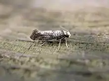 The wingspan is 11–14 mm. The head is white, sometimes ochreous-tinged. Thorax fuscous, sometimes whitish-sprinkled. Forewings are fuscous-whitish, closely irrorated with dark fuscous; some longitudinal series of indistinct dark fuscous dots; a dark fuscous entire fascia before middle; a white costal spot before apex; cilia fuscous, with two darker lines. Hindwings are fuscous. The larva is deep brown; subdorsal line white, orange-spotted; spiracular white, on 5-1 2 orange-spotted above; head ochreous-brown, blackish-marked.[1]