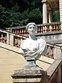 - On the intermediate terrace, right over the maze, there are two Italian-style pavilions with Tuscan columns and statues of Danae and Ariadne, replicas of round Roman temples without cella. Next to the great staircase that leads to the third level, there is a bust of Dyonysus, the god of wine and exuberance.