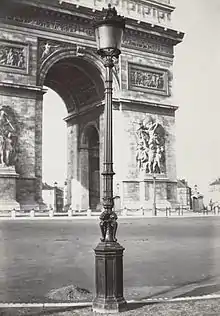 The gas was produced by ten enormous factories—located around the edge of the city, near the circle of fortifications—and was distributed in pipes installed under the new boulevards and streets. Haussmann placed street lamps every twenty meters on the boulevards. Shortly after nightfall, a small army of 750 allumeurs in uniform, carrying long poles with small lamps at the end, went out into the streets, turned on a pipe of gas inside each lamppost, and lit the lamp. The entire city was illuminated within forty minutes. The amount of light was greatly enhanced by the white stone walls of the new Haussmann apartment buildings, which reflected the brilliant gaslight. Certain buildings and monuments were also illuminated: the Arc de Triomphe was crowned with a ring of gaslights, and they outlined the Hôtel de Ville. The Champs-Elysees was lined with ribbons of white light. The major theaters, cafés, and department stores were also brightly lit with gaslight, as were some rooms in apartments in the new Haussmann buildings. The concert gardens, in which balls were held in summer, had gas lighting, as well as small gas lamps in the gardens, where gentlemen could light their cigars and cigarettes.[30]