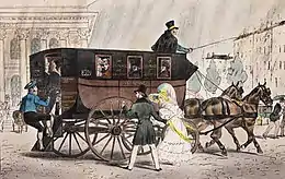 The other means of public transport was the fiacre, a box-like coach drawn by one horse that could hold as many as four passengers, plus the driver, who rode on the exterior. In 1855, the many different enterprises that operated fiacres were merged into a single company, the Compagnie impériale des voitures de Paris. In 1855, the company had a fleet of 6,101 fiacres with the emblem of the company on the door, and the drivers wore uniforms. The fiacres carried lanterns that indicated the area in which their depot was located: blue for Belleville, Buttes-Chaumont, and Popincourt; yellow for Rochechouart and the Pigalle; green for the Left Bank; red for Batignolles, Les Ternes, and Passy. The color of the lantern allowed customers leaving the theaters to know which fiacres would take them to their own area. The fare was 1.80 francs for a journey, or 2.50 francs for an hour. A wait of more than five minutes allowed the driver to demand payment for a full hour. The drivers were paid 1.5 francs per day for a working day that could last 15 to 16 hours. The company maintained a special service of plain-clothes agents to keep an eye on the drivers and make certain they submitted all the money they had collected. The fiacre was enclosed and upholstered inside with dark blue cloth. Fiacres figured prominently in the novels and poetry of the period; they were often used by clandestine lovers.[28]