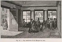 The Paris morgue was located on the Quai de l'Archevêché on the Île de la Cité, not far from the Cathedral of Notre-Dame-de-Paris. In order to assist with the identification of unclaimed bodies, it was open to the public. Bodies fished out of the Seine were put on display behind a large glass window, along with the clothes that they had been wearing. A doctor working at the morgue wrote, "A multitude of the curious, of all ages, sexes, and social rank, presses in every day, sometimes moved and silent, often stirred by horror and disgust, sometimes cynical and turbulent."[18] On June 28, 1867, a body found without a head, arms or legs was put on display. The head, arms, and legs were found a few days later, the body was identified, and the murderer tracked down and arrested. The system was macabre but effective; seventy-five percent of the bodies found in the Seine were identified in this way.[19]