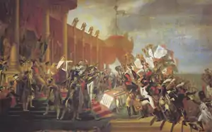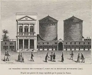 Panoramic paintings, large-scale paintings mounted in a circular room to give a 360-degree view of a city or an historic event, were very popular in Paris at the beginning of the Empire. The American inventor, Robert Fulton, who was in Paris to try to sell his inventions, the steamboat, a submarine and a torpedo, to Napoleon, bought the patent in 1799 from the inventor of the panorama, the English artist Robert Barker, and opened the first panorama in Paris in July 1799; it was a Vue de Paris by the painters Constant Bourgeois, Denis Fontaine and Pierre Prévost. Prévost went on to make a career of painting panoramas, making eighteen before his death in 1823.[47] Three rotundas were built on boulevard Montmartre between 1801 and 1804 to show panoramic paintings of Rome, Jerusalem, and other cities. They gave their name to the Passage des Panoramas, where they were located [48]