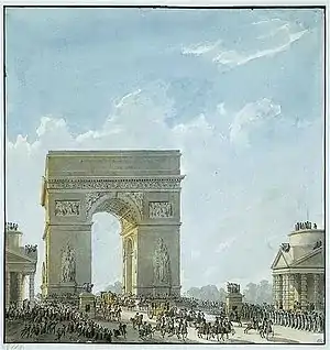 In 1806, in imitation of Ancient Rome, Napoléon ordered the construction of a series of monuments dedicated to the military glory of France. The first and largest was the Arc de Triomphe, built at the edge of the city at the Barrière d'Étoile, and not finished before July 1836. He ordered the building of the smaller Arc de Triomphe du Carrousel (1806–1808), copied from the arch of Arch of Septimius Severus and Constantine in Rome, next to the Tuileries Palace. It was crowned with a team of bronze horses he took from the façade of St Mark's Basilica in Venice. His soldiers celebrated his victories with grand parades around the Carrousel. He also commissioned the building of the Vendôme Column (1806–10), copied from the Trajan's Column in Rome, made of the iron of cannon captured from the Russians and Austrians in 1805. At the end of the Rue de la Concorde (given again its former name of Rue Royale on 27 April 1814), he took the foundations of an unfinished church, the Église de la Madeleine, which had been started in 1763, and transformed it into the Temple de la Gloire, a military shrine to display the statues of France’s most famous generals.[33]