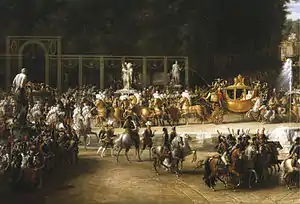 The calendar of Paris under Napoleon was full of holidays and festivals. The first great celebration was devoted to the coronation of the Emperor on 2 December 1804, which was preceded by a procession including Napoleon, Josephine and the Pope through the streets from the Tuileries to the Cathedral of Notre Dame, and followed on December 3 by public dances, tables of food, four fountains filled with wine at the Marché des Innocents, and a lottery giving away thousands of packages of food and wine. . The military victories of the Emperor were given special celebrations with volleys of cannons and military reviews; the victory at the Battle of Austerlitz was celebrated on 22 December 1805; of the Battle of Jena–Auerstedt on 14 October 1805.[40]