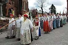 A parish festival[1] or parish fair[2] or indulgence feast[3] (Lithuanian: atlaidai; Polish: odpust parafialny) are local annual festivals held by Roman Catholic churches in Poland and Lithuania on a feast day of the patron saint of a given parish. Many of the festivals have long historic traditions that date back to the Counter-Reformation in the 16–17th centuries. Almost every parish has such festival with some churches having several.[4] Participants in these festivals can receive indulgences for themselves and their dead relatives.[5] The festivals include masses, religious processions, performances by church choirs, other music performances[6] and are often accompanied by traditional craft markets.[4] The feasts reinforce local identity and foster a sense of community.[4] Some of the larger festivals, like the Great Žemaičių Kalvarija Festival, last for a week, attract thousands of people, and are major pilgrimage events.[3][4]