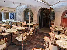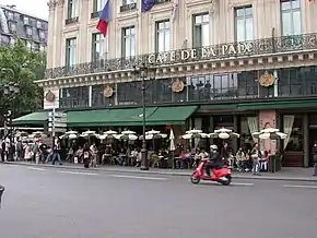 Typical Paris cafés are not coffee shops. They generally come with a complete kitchen offering a restaurant menu with meals for any time of the day, a full bar and even a wine selection. Among the drinks customarily served are the "grande crème" (large cup of white coffee), wine by the glass, beer ("un demi", half a pint, or "une pression", a glass of draught beer), "un pastis" (made with aniseed flavour spirit), and "un espresso" (a small cup of black coffee). Drinking at the bar is cheaper than doing so at one of the tables.[1] The café sometimes doubles as a "bureau de tabac", a tobacco shop that sells a wide variety of merchandise, including metro tickets and prepaid phone cards.