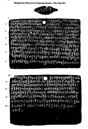 | Khoh | Maharaja Hastin | 156 (475 CE) | Grant of the Vasuntarashaika village by Maharaja Hastin to Gopasvamin and other Brahmins | [13] |
