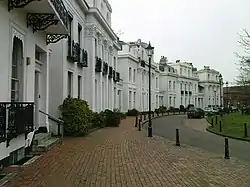 Arranged in a serpentine shape, the terrace overlooks thickly planted grounds of Amelia Park, in the manner of Bath.[1] It is built on a slight ridge close to what was in the 1830s the edge of the town by the boundary with the neighbouring parish of Heene and would have overlooked fields, with views extending to the parish churches of Tarring and Goring. There are two cottages ornés, originally called north and south Swiss Cottages, and now a hotel. It is likely that Wilds intended the 'alpine-style' cottages to be a discovery on walks into the woods of Amelia Park.[2] Park Crescent comprises 14 houses, each originally having three floors together with servants' quarters in the basement.