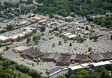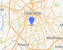 Park Road Shopping Center opened up on November 15, 1956 and was Charlotte's very first open area-type shopping mall. Developed by A.V. Blankenship, it is typical of Mid-Century modern architecture and the original billboard sign remains today. When the mall was first envisioned, it was considered to be a shift in area business development. At this time period most of the shopping areas were still located in and around downtown Charlotte. Meanwhile, more and more people continued to move to the suburbs and outlying areas of the city.[1] This has been the catalyst that has kept the shopping center successful to this day. Park Road Shopping Center is a very bustling mall and serves many of the surrounding Charlotte neighborhoods such as Myers Park, Barclay Downs, Parkdale, Colonial Village, Madison Park, Sedgefield, Ashbrook, and Starmount. In 1967 a local attorney named Porter Byrum bought Park Road Shopping Center. On June 16, 2011 Mr. Byrum announced that Park Road Shopping Center would be donated to 3 local colleges (Queens University of Charlotte, Wingate University, and Wake Forest University).[2] Mr. Byrum had held ownership of the shopping center for nearly 44 years. Just one month later these 3 colleges sold the shopping center for $82 million to EDENS, a shopping center operator and developer.[3] Despite these sudden changes in ownership, it is expected that the shopping center will continue on as is. It is easy to walk or bike to the Park Road Shopping Center since it lies on the Little Sugar Creek Greenway. In 2014 the center underwent a renovation. It was painted white, given wooden features, outdoor seating was added and the covered walkways got new lighting and floor treatment.