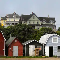 Homes overlooking fishing sheds at Parkers Cove, Nova Scotia