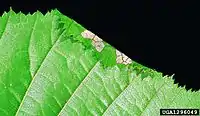 The larvae feed on Corylus avellana, Corylus colurna and Corylus maxima. They mine the leaves of their host plant. The mine consists of a small, rectangular mine between two side veins. The larva starts feeding in the spongy parenchyma. Later also the palissade parenchyma along the outline of the mine is consumed. In the end, all palissade parechyma is eaten away and the mine has become full depth. Most frass is deposited in a corner of the mine. After leaving the mine the larva lives in a folded leaf margin.[4]