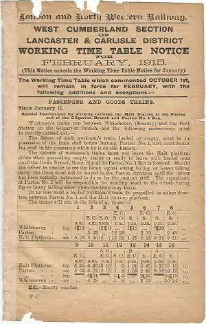 Goods traffic passed the halt, but did not call.[10] The April 1917 Working Time Table shows three Up mineral trains travelling a mile beyond the halt to No 4 Pit and two travelling beyond to Distington Ironworks, with an extra on Saturdays, all matched by Down trains.