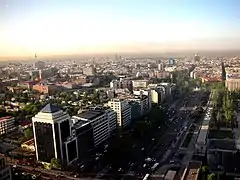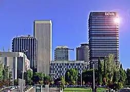 The financial center of Madrid is located along La Castellana or its immediate proximity, comprising locations such as AZCA, Puerta de Europa, and the CTBA.[11] The street also features several embassies and hotels.[12] Other landmarks found along this street include the Palacio de Congresos,[12] the headquarters of the Ministry of Defence,[12] and the Santiago Bernabéu Stadium.
