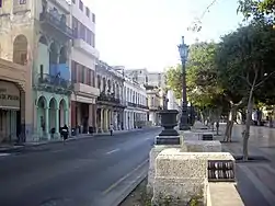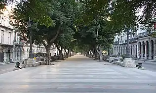 Paseo del Prado, is a promenade in Havana, Cuba near the old city wall, and the division between Centro Habana and Old Havana. Technically, the Paseo del Prado includes the entire length of Paseo Martí approximately from the Malecon to Calle Máximo Gómez,[lower-alpha 1] the Fuente de la India fountain. The promenade has had several names, it was renamed Paseo de Martí in 1898 with the island's independence from Spain. Despite the historic references, the people of Havana simply call it "El Prado."