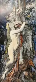 In the general understanding of the Minoan myth,[34] Pasiphaë and Daedalus'[35] construction of the wooden cow, allowed her to satisfy her desire[36] for the Cretan Bull. Through this interpretation she was reduced a near-divine figure (daughter of the Sun) to a stereotyped of grotesque bestiality and the shocking excesses of lust and deceit.[37]
